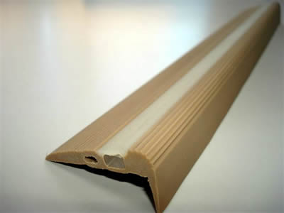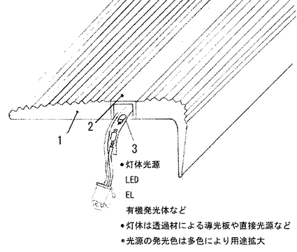 従来の階段用滑り止めに光源を装着し一体化したものは、滑り止めの表面に接着剤等で蓄光光源を装着したものと階段滑り止めにLED光源を金具等で取り付けしてあるものでした。前者は長時間の発光は出来ず、また、明るさが小さく周囲が暗くないと機能を発揮しない。後者は、明るさはよいが、本来の滑り止めとしての機能が重ねあわせ構造のため厚く安全に問題がありました。